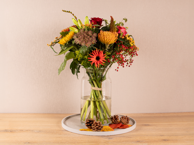 Rondgebonden boeket in warme tinten, compact geschikt met herfstige accenten.